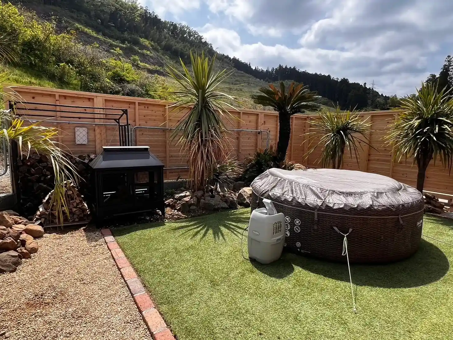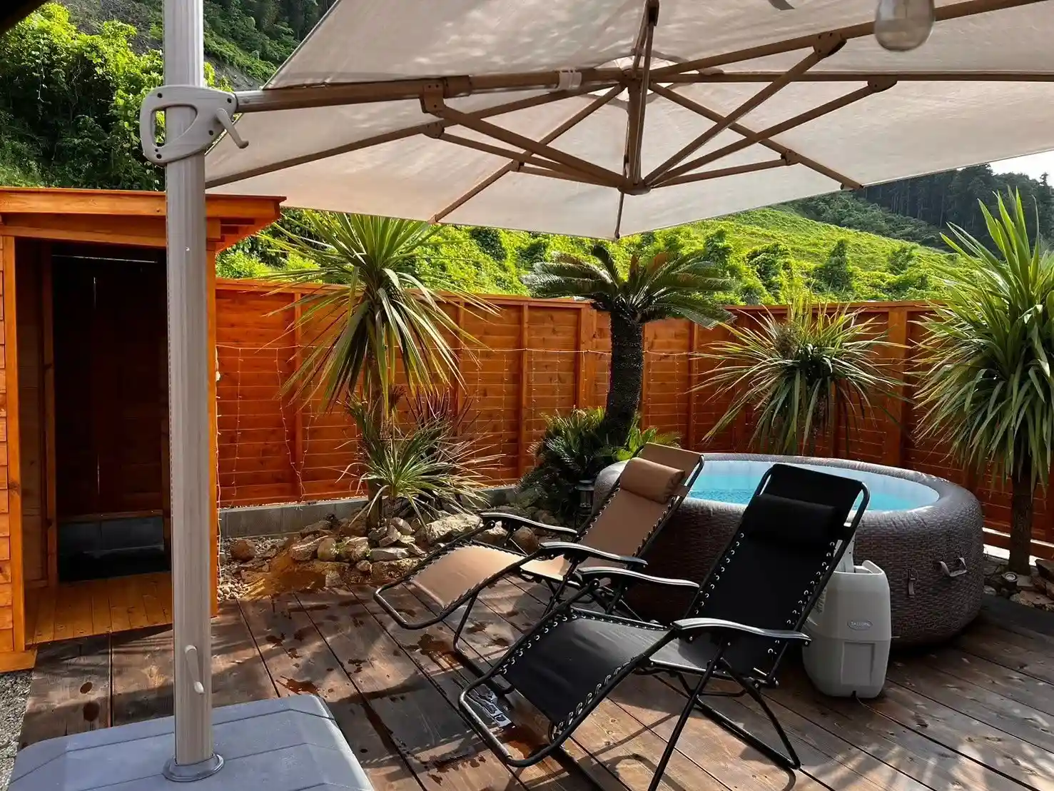 エントランスから進んで、左にはキャンピングトレーラー。右手正面にはコンテナモデルハウスがあり、その向かいには庭園スペース・ジャグジーがあります。